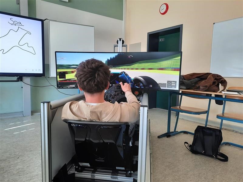 Großes Interesse weckte der Fahrsimulator, mit dem unsere Schülerinnen und Schüler in diesem Jahr eine Rennstrecke im belgischen Spa nachfahren konnten. Dieses Mal waren auch amerikanische Austauschschüler dabei, von denen auch einige den Fahrsimulator getestet haben.