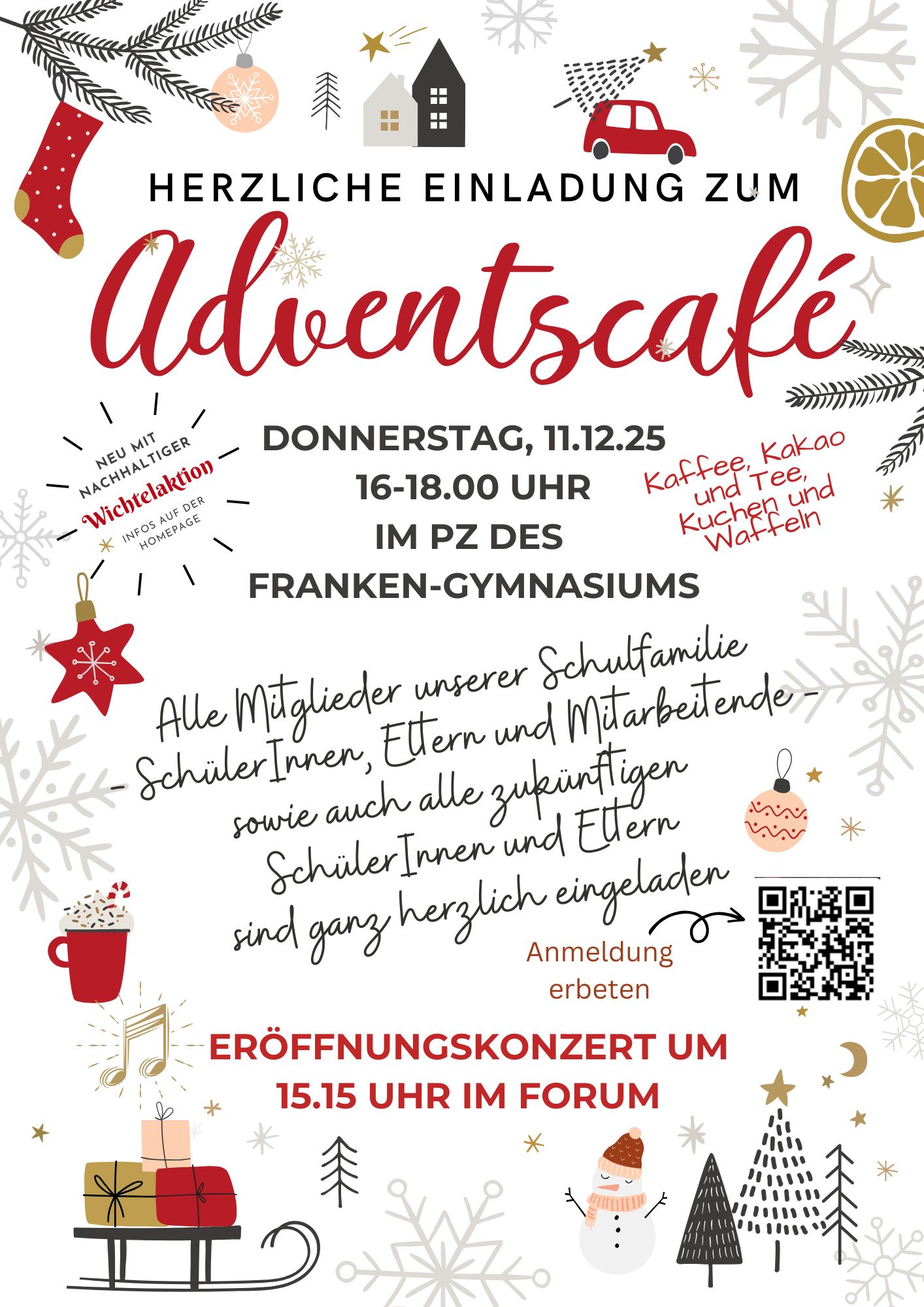 Wir möchten Sie und Ihre Familien herzlich zum diesjährigen Adventscafé am 11.12.25 einladen. Um 15.15 Uhr findet, wie bereits in den letzten Jahren, ein kleines Konzert, organisiert und geplant von der Fachschaft Musik, im Forum statt.