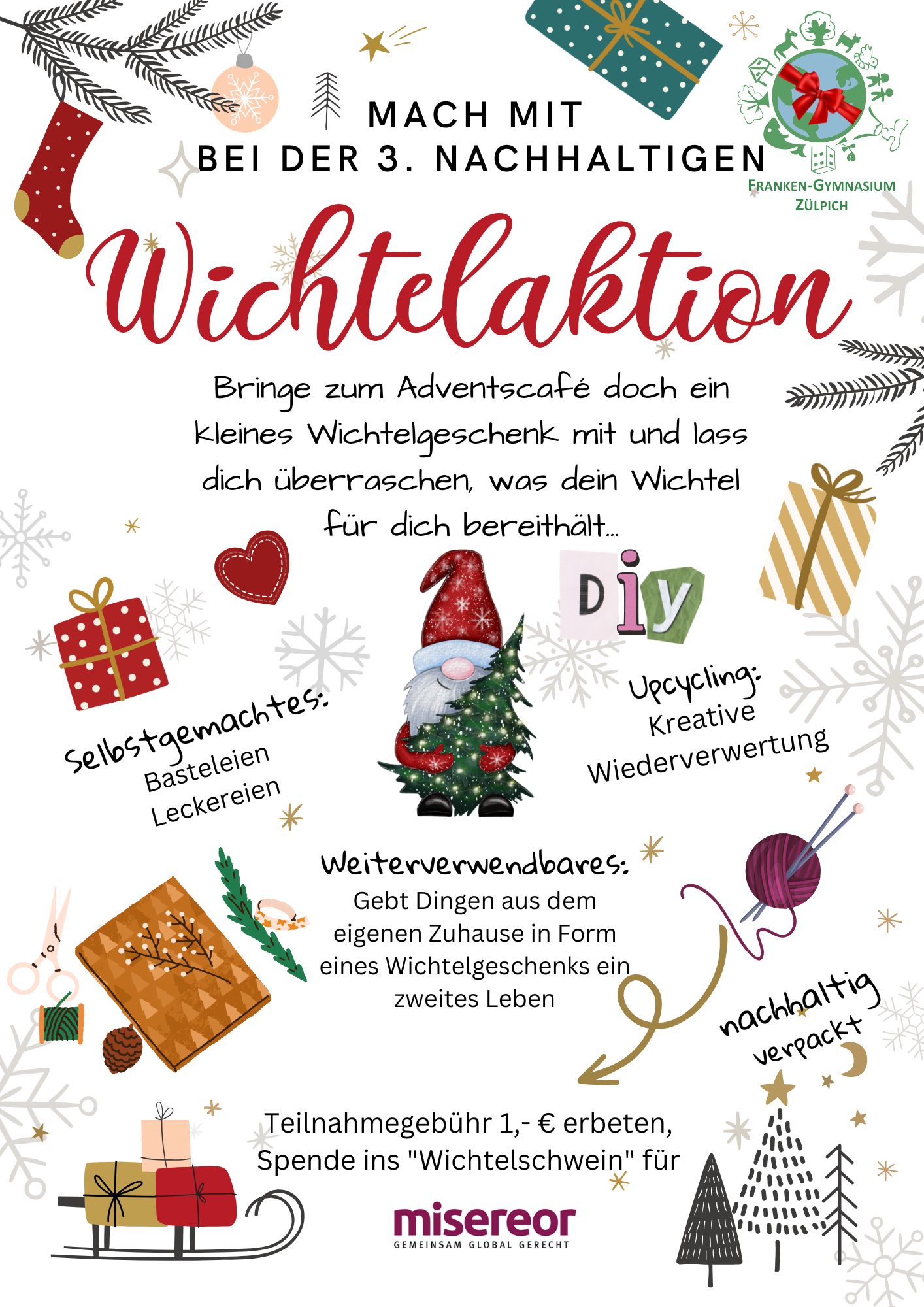 Außerdem möchte unsere Schulfamilie wieder eine nachhaltige Wichtelaktion anbieten und durchführen: Hierbei sind alle Besucherinnen und Besucher des